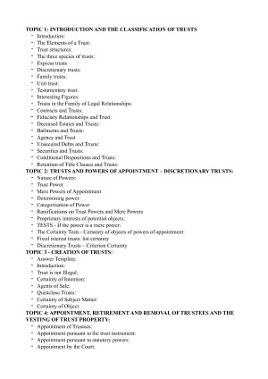 Extremely detailed and extensive trust notes, including case summaries and exam answer structures. Topics Include: - Introduction and the classification or Trusts - Trusts and Powers of Appointment - Discretionary Trusts - Creation of Trusts - Appointment - Retirement - Removal of Trustees - Vesting of Trust Powers - Duties an Powers of Trustees - Rights and liabilities of Trustees - Rights of Beneficiaries - Tracing - Variation and Termination of a Trust - Resulting Trusts - Constructive Trusts - Case Summaries