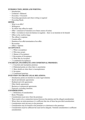 Extremely detailed and extensive notes for Contracts A. Includes detailed case summaries. Topics Include: - INTRODUCTION, DEEDS AND WRITING - OFFER - ACCEPTANCE - UNCERTAIN, INCOMPLETE AND CONDITIONAL PROMISES - INTENTION TO CREATE LEGAL RELATIONS - CONSIDERATION - PROMISSORY ESTOPPEL - CAPACITY - LEGALITY OF OBJECT - PRE-CONTRACTUAL STATEMENTS - PAROL EVIDENCE RULE AND INTERPRETATION OF TERMS - COLLATERAL CONTRACTS - IMPLIED TERMS AND CONSUMER GUARANTEES - EXCLUSION CLAUSES AND INCORPORATION OF TERMS - INCORPORATION OF TERMS -PRIVITY OF CONTRACT AND ASSIGNMENT OF CONTRACTUAL RIGHTS - CASE SUMMARIES