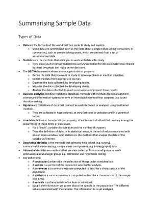 These notes are a comprehensive summary of QM161 compiled from lectures, lecture notes, and textbook readings. I received an HD in this unit with a mark of 97, so these notes are very high quality. They simplify complicated ideas, while explaining them succinctly. They will be beneficial to any student undertaking this unit, as this unit is generally considered to be quite difficult. Topic list: Topic 1 - Summarising Sample Data Topic 2 - Probability Topic 3 - Random Variables and Probability Distributions Topic 4 - The Central Limit Theorem Topic 5 - Statistical Inference 1 - Estimation Topic 6 - Statistical Inference 2 - Tests of Hypotheses Topic 7 - Correlation and Simple Linear Regression