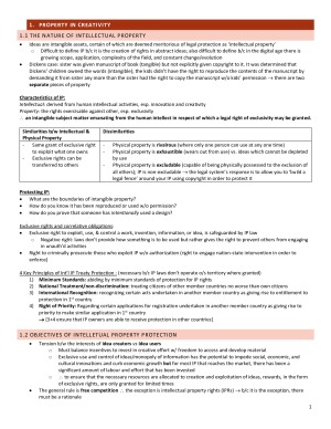 These notes are compiled from all of the lectures, all required readings, and includes answers/answer structures for the mini hypothetical questions posed during class for review purposes. The following topics are covered: - Property in Creativity - Copyright Subject Matter - Requirements for Subsistence - Ownership, Duration, Commercialisation of Rights - Copyright Infringement - Defences to Infringement - Moral Rights - Requirements for Design Registration - Infringement of Design Registration - Regulation of Copyright/Design Overlap