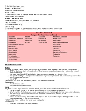 Includes the layout of the oral exam, and contains all information for category 1 medicines for Year 3, semester 2 (antibacterials, antivirals, LAMA, LABA, SAMA, SABA, etc.) Also covers the main treatment points for COPD & asthma Drug information covers: differential questions, differential Dx, dose, frequency, duration, conditions, indications, counselling advice, dosing instructions, side effects, precaution, some interactions, onset of action, mechanism of action, drug class Information is gathered from CMI, AMH, APF23, eTG, Uptodate