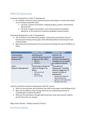 Notes from week one to twelve. Detailed and in-depth. Contents: 1. Structural Violence 2. Capitalism 3. Neoliberalism 4. Adverse Incorporation and Social Exclusion 5. Cultural hegemony 6. Post Colonialism 7. Post development 8. Gender 9. Race 10. Indignity 11. Global Futures/Revision