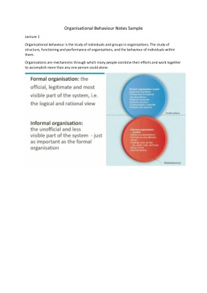 Includes all lecture notes + revision + assignment tips. Topics Included: Topic 1: Organisational Behaviour in the Global Economy Topic 2: Individual Attributes and their effects on Job Performance Topic 3: Motivating the Contemporary Workforce Topic 4: Managing Behaviour Through Learning Topic 5: Working and Performing in Groups and Teams Topic 6: Metaphors for Organisations Topic 7: Managing with Power and Politics in Organisations Topic 8: Leadership in the 21st Century Topic 9: Understanding Organisational Culture Topic 10: Organisational Change