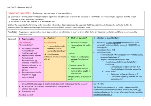 Exam & Hypothetical Notes for Evidence & Proof. Outlines: - Relevant case notes - Relevant parts of the Evidence Act annotated, colour co-ordinated and broken down into test elements - Principles and different approaches to running a case - Interaction between case law and Evidence Act - Diagrams & tests for how to answer a hypo question Topic List: 1. Introduction to Evidence & Proof 2. Case Theory Development 3. Hearsay Rule/Exceptions 4. Discretionary Exclusions 5. Opinion Evidence 6. Tendency & Coincidence Evidence 7. Credibility 8. Post Offence Conduct 9. Admission & Adverse Inferences