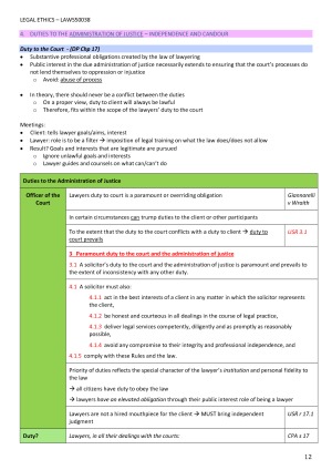 Exam & Hypothetical Notes for Legal Ethics. Outlines: - Relevant case notes - Colour coordinated - Interaction between case law and legislation - Includes ethical/legal obligations under the Civil Procedure Act as well as LPUL, Solicitor's/Barristers conduct rules - Diagrams & tests for how to answer a hypo question Topic List: 1. Lawyers' Ethics & Lawyer Regulation 2. The Role of Lawyers 3. Admissions and Fitness to Practise (brief) 4. Duties to the Administration of Justice - Independence & Candour 5. Duty of Confidence 6. Legal Professional Privilege 7. Duty of Care 8. Duty of Loyalty (Conflicts) 9. Costs Disclosure, Billing & Client Money 10. Ethical Behaviour & Decision-Making in Organisations 11. Complaints and Lawyers Discipline 12. Gorilla Exceptions & Ethical Apathy