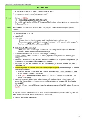 Exam & Hypothetical Notes for Corporations Law. Outlines: - Relevant case notes, theories and principles - Colour co-ordinated - Hypo structure for answering exam questions Topic List: 1. Introduction to Companies & the Regulatory Scheme 2. Incorporation & Consequences 3. Managing Companies 4. Directors' Duties - Overview 5. Directors 6. Consequences of Breach of Directors' Duties 7. Good Faith 8. Proper Purpose 9. Duty of Care 10. Loyalty 11. Related Party Transactions 12. Remedies 13. Corporate Liability 14. Share Capital 15. Corporate Insolvency