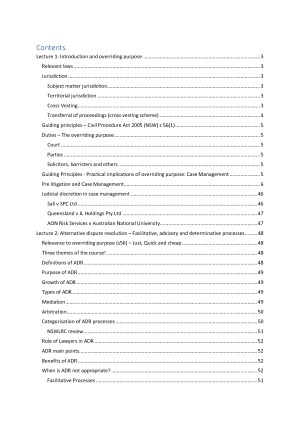 Notes include all topics covered throughout semester - Overriding purpose - Alternative dispute resolution - Initiating proceedings - interlocutory applications - UCPR - injunctions - Costs