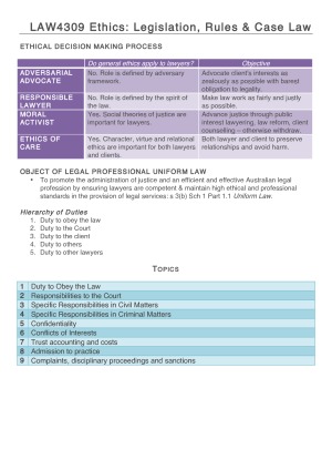 Summary of all legislation, ethical conduct rules and case law for the unit. Most useful for the exam (which is take-home, hence super long notes!), but can be helpful for the internal assessments as well! :) Topics: 1 Duty to Obey the Law 2 Responsibilities to the Court 3 Specific Responsibilities in Civil Matters 4 Specific Responsibilities in Criminal Matters 5 Confidentiality 6 Conflicts of Interests 7 Trust accounting and costs 8 Admission to practice 9 Complaints, disciplinary proceedings and sanctions