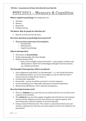PSYC1011 - Comprehensive High Distinction Notes (88 Final Mark)