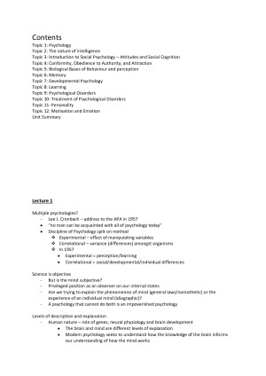 Contents Topic 1: Psychology Topic 2: The nature of intelligence Topic 3: Introduction to Social Psychology – Attitudes and Social Cognition Topic 4: Conformity, Obedience to Authority, and Attraction Topic 5: Biological Bases of Behaviour and perception Topic 6: Memory Topic 7: Developmental Psychology Topic 8: Learning Topic 9: Psychological Disorders Topic 10: Treatment of Psychological Disorders Topic 11: Personality Topic 12: Motivation and Emotion Unit Summary