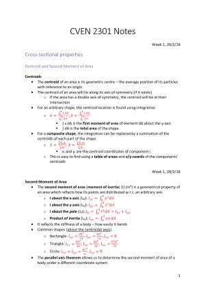 Notes cover all topics of the course in a week-by-week layout with detailed explanations, diagrams and formulae, taken from the textbook and tutorial problem sets Topics included: - Properties of Cross Sections - Concept of Stress - Concept of Strain - Mechanical Properties of Materials - Hooke's Law - Axial Force and Compatibility - Elastic/plastic/inelastic bending and Composite Sections - Beam deflections and Indeterminate Beams - Shear stress, flow and centre in beams - Torsion