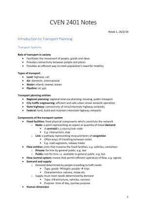 Notes cover all topics of the course in week-by-week layout with detailed explanations, diagrams and formulae, taken from the lectures, textbook and tutorial problem sets Topics covered: - Traffic Flow Theory - Queuing Theory - Trip Generation - Trip Distribution - Mode Choice - Introduction to Road Design - Speed Parameters - Horizontal Alignment - Vertical Alignment - Cross Sections - Earthworks