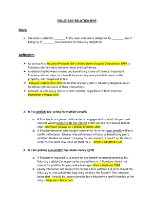 - Very clear and succinct notes organised in colours and tables. - Enables quick and easy reference for exam with enough detail to add depth to your answers. - All in plain, easy to read English! - If satisfied with these notes see PART 1 (TRUSTS) for complete set. Topics Include: Unconscionable conduct, undue Influence, equitable fraud, property in equity, equitable estoppel, assignments in equity (Milroy), Fiduciary Relationships, confidential information.