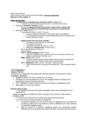 This note covers from w6 to w11, including all of the detailed cases as well as the knowledge you need for the final exams. (specifically for the final exam) chapter week6: Topic: Consumer Protection - Overview, Misleading or Deceptive Conduct, Unconscionable Conduct, Specific False or Misleading Representations. week7: Topic: Consumer Protection - Unfair Contract Terms, Enforcement and Penalties, and Consumer Guarantees. week8: Topic: The Law of Torts Introduction. Liability for negligent acts causing physical or psychological harm or pure economic loss - duty, breach, damage and defences. week9: Topic: The Law of Torts - Professional Negligence, Breach of Duty, the Statutory Defence, Damage. week10: Topic: The Law of Business Organisations - Agency and Partnerships. week11: The Law of Business Organisations - Corporations Law and Trusts
