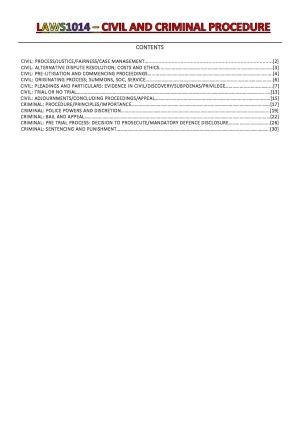 CIVIL: PROCESS/JUSTICE/FAIRNESS/CASE MANAGEMENT[2] CIVIL: ALTERNATIVE DISPUTE RESOLUTION; COSTS AND ETHICS[3] CIVIL: PRE-LITIGATION AND COMMENCING PROCEEDINGS[4] CIVIL: ORIGINATING PROCESS; SUMMONS, SOC, SERVICE[6] CIVIL: PLEADINGS AND PARTICULARS: EVIDENCE IN CIVIL/DISCOVERY/SUBPOENAS/PRIVILEGE.[7] CIVIL: TRIAL OR NO TRIAL[13] CIVIL: ADJOURNMENTS/CONCLUDING PROCEEDINGS/APPEAL[15] CRIMINAL: PROCEDURE/PRINCIPLES/IMPORTANCE[17] CRIMINAL: POLICE POWERS AND DISCRETION[19] CRIMINAL: BAIL AND APPEAL[22] CRIMINAL: PRE TRIAL PROCESS: DECISION TO PROSECUTE/MANDATORY DEFENCE DISCLOSURE[26] CRIMINAL: SENTENCING AND PUNISHMENT.[30]