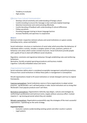 High distinction MGF3681 CURRENT Exam notes covering every aspect of the materials covered in lectures, tutorials and readings (weeks 1 to 12 and additional materials) into one comprehensive document. Uses helpful diagrams, examples and explanations to clearly cover everything in the unit. PLUS MGF3681 Exam Preparation Questions. On average, 5 questions per weekly topic. Questions in the REAL EXAM are normally either based off or taken from this list of questions. Consists of some practice exam questions, tutorial questions, mentions and examples made by lecturers and tutors as well as hints from tutorials and lectures. INCLUDES FORMULA TO GET FULL MARKS ON A QUESTION Topics included in notes (not an exhaustive list): - Intro to International Management - International Management vs International Business - Challenges of International Management - Cultural dimensions of IM - Ethics in IM - Social responsibility (CSR, employees, laws) - Communication in IM - Cross-cultural communication - Managing across national boundaries - Managing across cultures - Conflict in IM - Negotiations in IM - Organisational structures - Motivation in IM - Leadership and best practice in international contexts - International Human Resource Management (IHRM) - Managing international teams - Advantages and disadvantages of types of teams