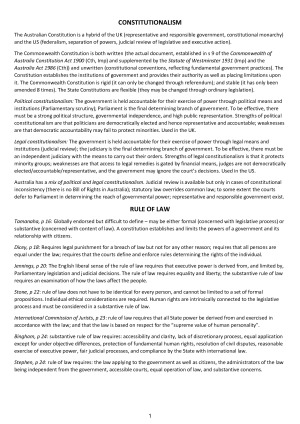 Notes covering the ENTIRE LAWS1141 final exam. Received a Distinction with a final mark of 80 for this course. Covers ALL final exam topics including: Political and Legal Constitutionalism Rule of Law The Washminster Hybrid Indigenous Sovereignty Popular Sovereignty Parliamentary Sovereignty The History of Federation The Legislature The Executive The Judiciary The Separation of Powers Statutory Interpretation State Constitutions and Legislatures Rights Protection Constitutional Change Federalism Human Rights and Bills of Rights