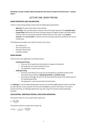 Notes covering the ENTIRE FINS2624 course, as well as the CUSTOM FINAL EXAM FORMULA SHEET. Received a High Distinction with a final mark of 86 for this course. Covers course topics: Bond Pricing Term Structure of Interest Rates Markowitz Portfolio Theory Optimal Portfolios The Capital Asset Pricing Model (CAPM) The SIM and Factor Models Option Strategies Option Valuation