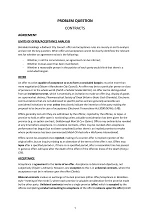 Notes covering the ENTIRE LAWS1150 final exam. Received a Distinction with a final mark of 77 for this course. Covers ALL final exam topics including: Formation of Contract Offer and Acceptance Analysis Intention to Form Legal Relations Consideration Certainty Privity Estoppel The Definition of Property The Distinction Between Property and Contract Leases and Licences New Forms of Property The Definition of Land The Doctrine of Fixtures Chattels and Bailment The Concept of Possession Adverse Possession The Torts of Trespass, Detinue, and Conversion Agency