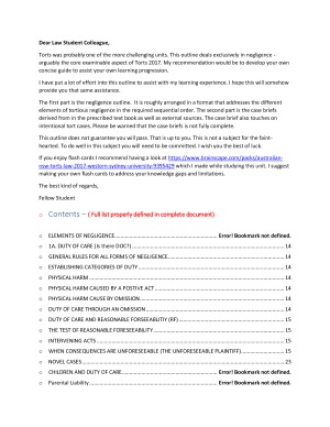 This study notes directly deals with the torts of negligence. Of the 14 weeks of the semester, negligence made up 12 weeks if the unit. All the readings were completed and important parts were extracted into the study notes. The study notes also include an almost complete case brief of most cases covered and provides a link to flash cards. Sidenote: Content/bookmarks are properly defined in full study notes.