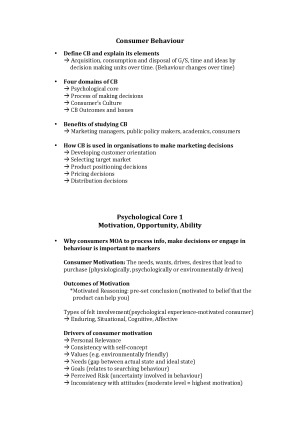 My Consumer Behaviour notes are a summary of the lecture notes and the textbook. They are perfect to use for the mid sem/final exam as they summarise every topic, get straight to the point with what you need to know for the exams and explain the most important points without going into way too much detail.