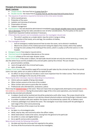 These notes are summaries of all the lecture during the semester. Perfect for studying. Topics covered: Introduction to crime scene Introduction to marks and impressions Introduction to Forensic Taphonomy Introduction to Microtraces Introduction to fingerprints Introduction to law Basic criminal law concepts Basic evidence law concepts Expert evidence, legal issues for forensic scientist