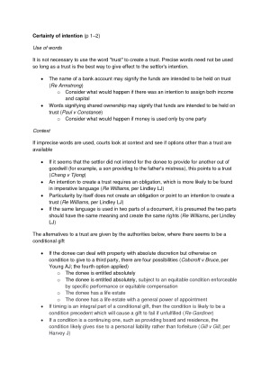 The first 27 pages cover each topic in the reading guide: creation of trusts, quistclose trusts, formalities, trustee duties, exclusion of liability, rights of beneficiaries and remedies. These topic summaries show you which situations to cite which cases in an easy to read format. Conflicting authorities and points of distinction are easy to find. The remaining 35 pages consist of case summaries, including facts and judgments. The cases are also sorted by topic.