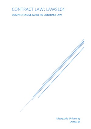 These notes are clearly structured, understandable and informative. They have been created with regard to the weekly lectures as well as readings. Highly recommend purchasing if you're looking for an additional source to assist with your studies/overview of the course or if you've missed a few lectures here and there. Introduction to Contracts Agreement – Offer & Acceptance Consideration; Equitable Estoppel; Intention Certainty & Completeness; capacity; Requirement of Writing Express Terms Implied Terms; Construction of Terms; Exclusion Clauses Misrepresentation; Misleading or Deceptive Conduct Duress; Unconscionability; Undue Influence; Unjust Enrichment Discharge by Performance; Discharge by Agreement Discharge by Breach; Discharge by Frustration Illegality Privity of Contract