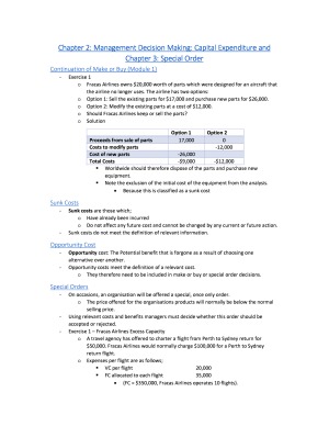 These notes are the lecture notes for chapter 1 to chapter 10, which are covered throughout the semester. Key words are bolded. Chapters covered: Week 1 - Chapter 1: Introduction to Accounting and Chapter 2: Management Decision Making Week 2 – Chapter 2: Management Decision Making: Capital Expenditure and Chapter 3: Special Order Week 3 – Chapter 4: Management Decision Making: Budgeting and Chapter 10: Cash Management Week 4 - Chapter 5: Business Sustainability Week 5 – Revision for mid-semester test Week 6 - Chapter 6: Accounting cycle I - Recording business transactions and accounting for service entities: Part A Week 7 – Chapter 6: Accounting cycle I - Recording business transactions and accounting for service entities: Part B Week 8 – Chapter 7: Accounting cycle II: Accounting for retail entities and GST Week 9 – Chapter 8: Accounting cycle III – End of period adjustments and closing entries Week 10 – Chapter 9: Financial statements of companies Week 11 – Chapter 10: Accounting information system and internal control I received an overall mark of 90% for this unit.