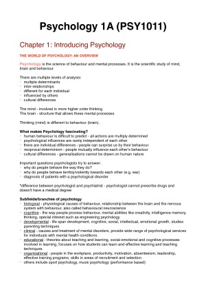 Notes are based on weekly readings from the prescribed textbook, and lectures and cover the following topics: 1. Introducing psychology 2. Human development (developmental psych) 3. Personality 4. Learning 5. Biological psychology 6. Sensation and perception 7. Culture and psychology 8. Indigenous psychology 9. Motivation
