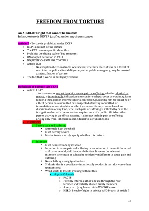 These are a combination of lecture notes, summaries and independent research that I used for the final take home exam. Many of the cases listed are from Sarah Joseph's online textbook that I have summarised and noted key principles relating to each one. These notes are extremely in-depth and all you need to take on LAW4155! Topics Include: 1. Intro to HR 2. HR Institutions 3. Enforcement 4. Limitations to HR 5. Freedom of Expression 6. Freedom from Torture 7. Economic, Social and Cultural Rights 8. Cultural Relativism 9. Non-State Actors 10. Australia and HR 11. Challenges to HR Discourse