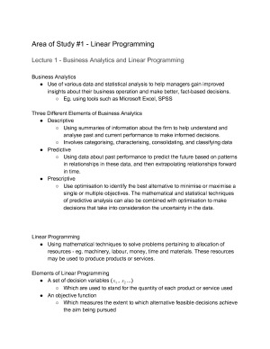 In-depth subject review that covers lectures 1 through 10 (all content lectures) with all lecture content, anything else that is examinable, and case Studies/Examples from class as well as independent research. Topics include: Lecture 1 - Intro to Business Analytics and Linear Programming Lecture 2 - More Linear Programming Applications (Marketing, Financial, Operations Management) Lecture 3- Even More Applications of Linear Programming #2 (Transportation, Assignment, Transshipment) Lecture 4- Integer Programming Applications Lecture 5 - Decision Analysis Part 1 Lecture 6 - Decision Analysis Part 2 Lecture 7 - Descriptive Statistics and Probabilities Basics Lecture 8 - Probability Distribution Lecture 9 - Linear Regression Model Lecture 10 - Multiple Regression