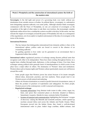 Contains relevant content from all weeks and modules, plus 90% of the readings summarised. Modules: 1 - Introduction 2 - Westphalia 3 - International History (1900 - 1945) 4 - International History (1945 - 1989) 5 - International History (1989 - 2018) 6 - Liberalism 7 - Realism/Neorealism 8 - Marxism 9 - Postpositivism 10 - Gender in IR 11 - Constructivism 12 - Post-structuralism 13 - Post-colonialism