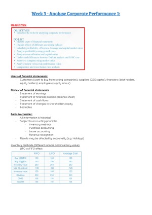 Detailed notes on each lecture, including: - Top down analysis - Analyse Corp performance 1 - Analyse Corp performance 2 - Forecast performance - Cash flow analysis - Equity valuation 1 - Equity Valuation 1 - Reliance on accounting numbers - Credit judgement - Risk analysis - Trends, valuation and review