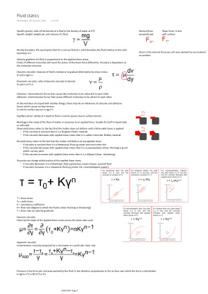 Notes covering all topics of Fluid and Particle Mechanics e.g fluid statics, fluid dynamics, pumps, fluid modelling, single and multiple particles, batch settling and particle beds. Key parts of lectures including important diagrams and formulae are included