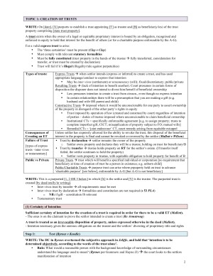 These notes are without a doubt the best notes you will ever find! They show a detailed 'step-by-step' process on how to answer trust exam questions. Hundreds of hours went into preparing these notes and I don't think you would be able to find better. I completed the subject in Semester 2 2017 and obtained a score of 76. The topics covered in these 'Trusts Notes' are: - Creation of Trusts (including certainty of intention, subject matter and object, constitution, formalities) - Quistclose trusts and Charitable purpose trusts - Trustee's Duties - Trustee's defense and limitations on liability - Rights of a Trustee - Rights of Beneficiaries - Remedies for Breach of Trust