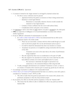 Incredibly comprehensive and extensive notes from ALL lectures, tutorials and relevant cases. Very good notes to use a substitute for lectures. These notes have all content from class discussions and problem questions explained. I used these notes to get 100% for tutorial participation. These notes contain ALL topics, including: Agreement, Certainty, Consideration, Intention (ITCLR), Estoppel, Terms, Construction, Exclusions Clauses, Privity, Discharge by Performance, Agreement, Conditions, Breach, Repudiation, Termination, and Frustration.