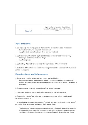 These notes are a compilation of almost every resource and reading in the SCLG2602 course. With summaries of the required readings, comprehensive notes from lectures, tutorial discussions and independent research these notes will save you hours and give you everything you need to excel in Qualitative Methods. Don't waste time on reading through the textbook and hundreds of readings - just grab these and power your way through the course in 73 short pages packed with crucial concepts and explanations. • Introduction • Ethics in Research • Research and Reflexivity • Designing a research project • Interviewing: form and function • Interviewing: the reality and experience • Entering the field: fieldwork and ethnographic research • Ethnography in focus • Unobtrusive and online methods • Research with purpose: PAR • Interpreting and coding data: content analysis • The Census in focus