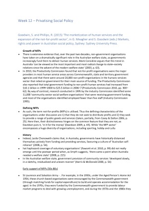 These notes are a compilation of almost every resource and reading in the SCPL2602 course. With summaries of the required readings, comprehensive notes from lectures, tutorial discussions and independent research these notes will save you hours and give you everything you need to excel in Principles of Social Policy Don't waste time on reading through the textbook and hundreds of readings - just grab these and power your way through the course in 52 short pages packed with crucial concepts and explanations. • Introduction to Social Policy • Goals of Social Policy • Ideology & Social Policy • Social Justice & Social Policy • Human Behaviour & Social Policy • Citizenship & Social Policy • Gender & Social Policy • Globalisation & Social Policy • The Role of the State in Social Policy • Redistribution & Social Policy • Privatising Social Policy