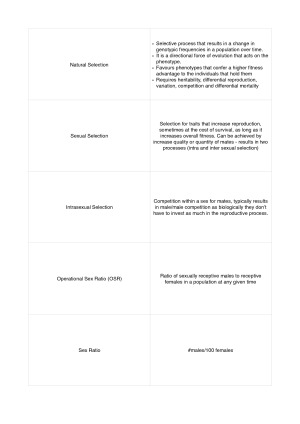Palm cards reviewing all the key topics needed for the exam. Includes natural selection, sexual selection, competition, mate choice, preference traits, different pairing styles (monogamy, polygamy etc.), theories of polygyny, parental investment, various hypotheses (incl. Trivers-Willard, Local resource enhancement etc.), grandmothering, reproductive theories, different breeding styles, kin selection, alturism, alturism theories, infanticide, life history theory, group fission/fusion - literally everything you need to know