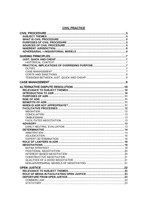 Complete summary covering the entire Civil Practice semester from beginning to end, including ALL case notes and relevant authorities for assignments and final exam. This summary incorporates notes from the required readings, additional readings, lecture slides and tutorials. Civil Practice is a content-dense subject so a perfect, concise set of notes is exactly what you need to ace the subject! - Purposes of Civil Procedure - Sources of Civil Procedure - Inherent Jurisdiction - Just, Quick and Cheap - Historical Context - Practical Implications of Overriding Purpose - Duties - Case Management - Costs and Sanctions - Tensions Between Just, Quick and Cheap - Case Management - Alternative Dispute Resolution - The Purpose of ADR - The Rise of ADR - The Benefits of ADR - When Is ADR Not Appropriate? - Facilitative Processes - Mediation - Conciliation - Ombudsman - Facilitated Negotiation - Advisory - Early Neutral Evaluation - Determinative - Arbitration - Adjudication - Expert Determination - Role of Lawyers in ADR - Negotiations - BATNA Strategy - Positional Negotiation - Interest-Based Negotiation - Constructive Negotiation - Non-Adversarial Models of Negotiation - Open Justice - Role of Media In Facilitating Open Justice - Departure from Open Justice - Access to Justice - Access to Dispute Resolution Processes - Pre-Litigation Steps - Lawyer’s Duties - Pre-Litigation Steps - Client Care - Commencing Litigation - Jurisdiction - Subject Matter Jurisdiction - Territorial Jurisdiction - Cross-Vesting - Transferal of Proceedings - Pleadings - Purpose of Pleadings - Key Rules of Pleadings Generally - Originating Process - Statement of Claim - Summons - Strike Out and Embarrassment - Options for Defendants - Cross-Claim - Joining Parties - Service - Originating Process - Other Documents - Substituted Service - Evidence in Proceedings - Key Terms - Affidavits - Discovery and Inspection - Subject Themes - Demise of Discovery - Discovery in Supreme Court Equity Division - Preliminary Discovery - Ordinary Discovery - Notice to Admit - Interrogatories - Notices to Produce - Subpoenas - Objections to Produce: Privilege - Interlocutory Applications - Motions - Security for Costs - Injunctions - Mareva Orders - Anton Piller Orders - Operation of Interlocutory Applications - Evidence in Support of the Application - Obligation of Candour - Hearsay in Interlocutory Applications - Urgent Applications - Directions - Applications for Expedition - Usual Undertaking as to Damages - Costs - Settlement - Different Types of Costs Awards - Additional Costs Orders in Multi-Party Litigation - Primary Rule as to Costs - Costs as a Means of Managing Litigation - Legislative Framework - Bases Upon Which Costs Can Be Awarded - Common Types of Costs Orders - Assessing Costs - Costs Against Legal Practitioners - Strike Out - Summary Disposal - Summary Judgment - Summary Dismissal - Default Judgment - Dismissal for Want Of Due Despatch - Vexatious Litigants - Judgment Enforcement - Judgment Enforcement - Orders Against Third Parties - Appeals - Subject Matter of an Appeal - Notices of Appeal - Grounds of Appeal - Time to Appeal - Appeal Books CASE NOTES - Queensland v JL Holdings Pty Ltd (1997) 189 CLR 146 - AON Risk Service v Australian National University (2009) 239 CLR 175 - Bulldogs Rugby League Club Ltd v Williams [2008] NSWSC 822 - Gunns Ltd v Marr [2005] VSC 251 - Dow Jones & Co v Gutnick (2002) 210 CLR 575 - Markisic v Department of Community Service of NSW (No 2) [2006] NSWCA 321 - Silversides Superfunds Pty Ltd v Silverstate Developments Pty Ltd [2008] NSWSC 904 - General Steel Industries Inc v Commissioner for Railways (NSW) (1964) 112 CLR 125 - Vaughan v Dawson [2005] NSWSC 33 - Legal Services Commissioner v Mullins [2006] QLPT 12 - Firth v Latham & Ors [2007] NSWCA 40 - Kain v Mobbs (No 2) [2008] NSWSC 599 - Attorney General of NSW v Rahman [2014] NSWSC 42 LIGHTNING TALK - Mediation