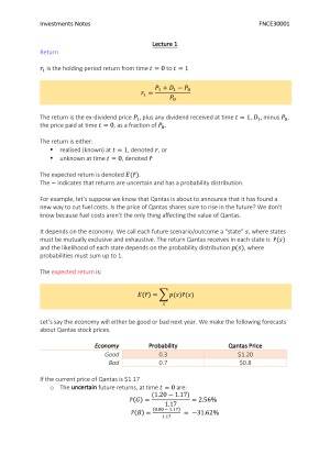 Clear and structured notes, including thorough explanations as well as detailed examples. Topics are discussed and explained in detail and additional examples are included in order to ease understanding. Topics covered are: Risk Aversion and Returns Optimal Portfolios Capital Asset Pricing Model Single Index Models Arbitrage Pricing Theory and Multifactor Models Portfolio Performance Evaluation Fixed Income Valuation Coupon Bonds Term Structure Models and Bond Risks Basics Managing Fixed Income Portfolios