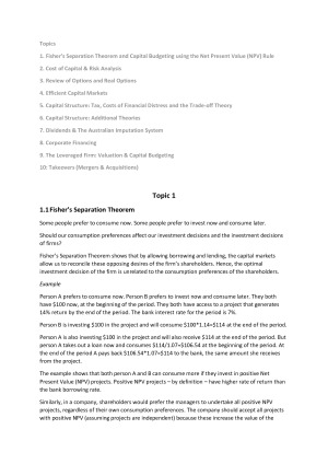 Corporate Finance is a theory heavy subject! We stuffed up the assignment so I had to prepare very detailed notes merging the material from the book into my lecture notes, checking against the slides. I scored 90% on the exam with the help of these notes and my friend studying from it got a D too! You'll find it takes 2-3 days to read though, quite a lot of information on 45 pages!! Topics 1. Fisher’s Separation Theorem and Capital Budgeting using the Net Present Value (NPV) Rule 2. Cost of Capital & Risk Analysis 3. Review of Options and Real Options 4. Efficient Capital Markets 5. Capital Structure: Tax, Costs of Financial Distress and the Trade-off Theory 6. Capital Structure: Additional Theories 7. Dividends & The Australian Imputation System 8. Corporate Financing 9. The Leveraged Firm: Valuation & Capital Budgeting 10: Takeovers (Mergers & Acquisitions)
