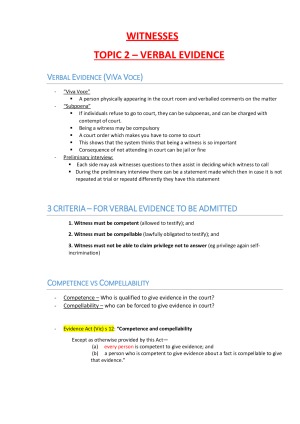 Easy to follow notes. All legislation highlighted in yellow, all cases in green. All cases are summarised and outlined in tables, clearly stating - facts, issue, finding. Includes lecture notes and merged study guides/online readings/case summaries. Main topics include: T1. Overview of evidence law Burden of proof/Witnesses T2. Verbal evidence Competence & compellability T3. Witness examinations T4. Documents & other evidence T5. Admissibility of evidence Relevance T6. Hearsay Maker available Maker not available T7. Admissions T8. Opinion Rule T9. Tendency & Coincidence Evidence T.10 Character Evidence T.11 Privilege T12. Mandatory and discretionary exclusions