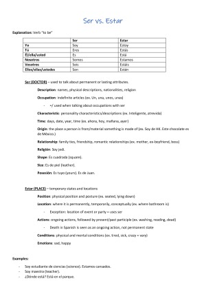 44 pages of fully typed SPAN1621 notes. Covers ALL grammar topics covered in class. Includes extra information from a variety of sources + useful diagrams and illustrations that make memorization a lot easier These notes helped me score 85 (High Distinction) for SPAN1621! Topics covered: - ser vs. estar - hay - estar vs. hay - subject pronouns - gender: masculine or feminine noun - definite vs. indefinite articles - possessives - para vs. por - por qué, porque, por que, porqué - gustar - regular verbs - present tense - irregular verb - reflexive verb - imperfect tense - preterite (indefinido) - imperfect tense - common phrases - interrogative pronouns - connector and vocabulary - list of confused words - date, number, climate, greeting