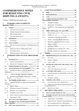 29 downloads! The most comprehensive set of notes on all examinable topics, arranged according to the syllabus. Includes summaries of the Future of Dispute Resolution and Principles of Civil Procedure readings, and prescribed and extracted cases. Clear headings for each topic and cases; table of contents for easy navigation. I achieved a mark of 80+ with these notes.