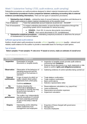 Comprehensive notes for ACCT3708. Content sourced from lecture slides (including notes from lecturer), prescribed text and industry knowledge. These notes cover the below topics, as per the course outline: 1) Introduction to the Audit Function, Assurance Framework, Regulation of Audits and Auditors’ Legal Liability 2) Risk, Error and the Audit Process 3) Business Risk 4) Internal Controls I: Control Environment and Manual Controls 5) Internal Controls II: Internal Controls in an IT Environment 6) Internal Controls III: Tests of Controls and Communication with Management 7) Substantive Tests I: Audit Evidence, Test of Detail and Audit Sampling 8) Substantive Tests II: Test of Detail in IT Systems, Substantive Analytical Procedures, Subsequent Events and Going Concern 9) Using the Work of Others and Fraud 10) Audit Strategies 11) Audit Reporting 12) Other Assurance Services and Ethics