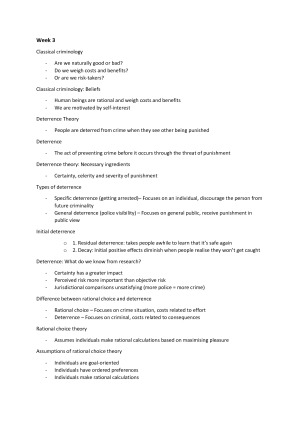 This document includes every term and its definition that you need to know for CRIM1000. I constructed it from all 12 lectures (13 is just a exam review) and made it simple to understand. It is structured so that you can print it off and use it as flashcards (I did this and received a GPA of 6 and an email from the head of school congratulating me on my high achievement). Or you can simply study all the terms. I guarantee it will get you a great mark if you memorise it. Topics Covered: 1. Introduction: The Study of Crime 2. Theory and Policy in Context/Gender and Crime 3. Classical Criminology 4. Biological Factors and Criminal Behaviour 5. Psychological Factors and Criminal Behaviour 6. Developmental Theories 7. Learning Theories 8. Control Theories 9. Anomie and Strain 10. Neighbourhoods and Crime 11. Conflict Criminology and Labelling 12. Integrated Theories