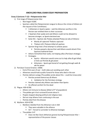 I wrote this document to help me prepare for the final exam's essay section (where you have to write 2 essays in exam conditions). The first essay is based on lectures 1-6 and the second essay is based on lectures 7-12. I chose these topics to revise because they are broad and have been on all of the previous exam papers. I have also included notes for both ancient sources and modern scholarly debates for each topic, which are both required for the essays. * Lectures 1-6: Persian Wars * Lectures 7-12: Peloponnesian War If you would prefer to have a revised version of all the lectures, check out my "ANCH1240 All 12 Lectures Summarised".
