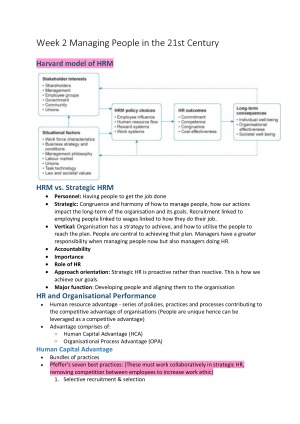 These are Distinction level notes, they include everything in the lectures, notes by the lecturer, and notes from readings, and what is prioritised for the exam. I relied purely on my notes for revision (thank god) and it pulled my average up. The notes specifically cover 1. Intro 2. Managing People in the 21st Century 3. Ethics, Social Responsibility and Sustainable Development 4. Ethical and moral issues when Managing Human Resources 5. Managing Human Resource to Support Business Sustainability 6. Emotion at Work 7. The Regulation of the employment Relationship 8. Meeting Employee Expectations 9. Providing Formal and Informal Performance Feedback Diversity and Inclusion Psychosocial Hazards in the Workplace the Organisation Dynamics of Downsizing and Change